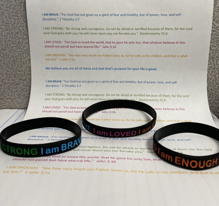 Alongside church partners in August 2022, Heritage Builders hosted a life skills training for teens living in foster care in Jefferson County, Alabama. As part of this training, mentors and leaders discussed the importance of healthy relationships and why each youth was worthy of being in trustworthy, safe, and consistent relationships. As a tangible reminder of this truth, they were given silicone bracelets with the statements, “I am brave. I am strong. I am loved. I am enough.”