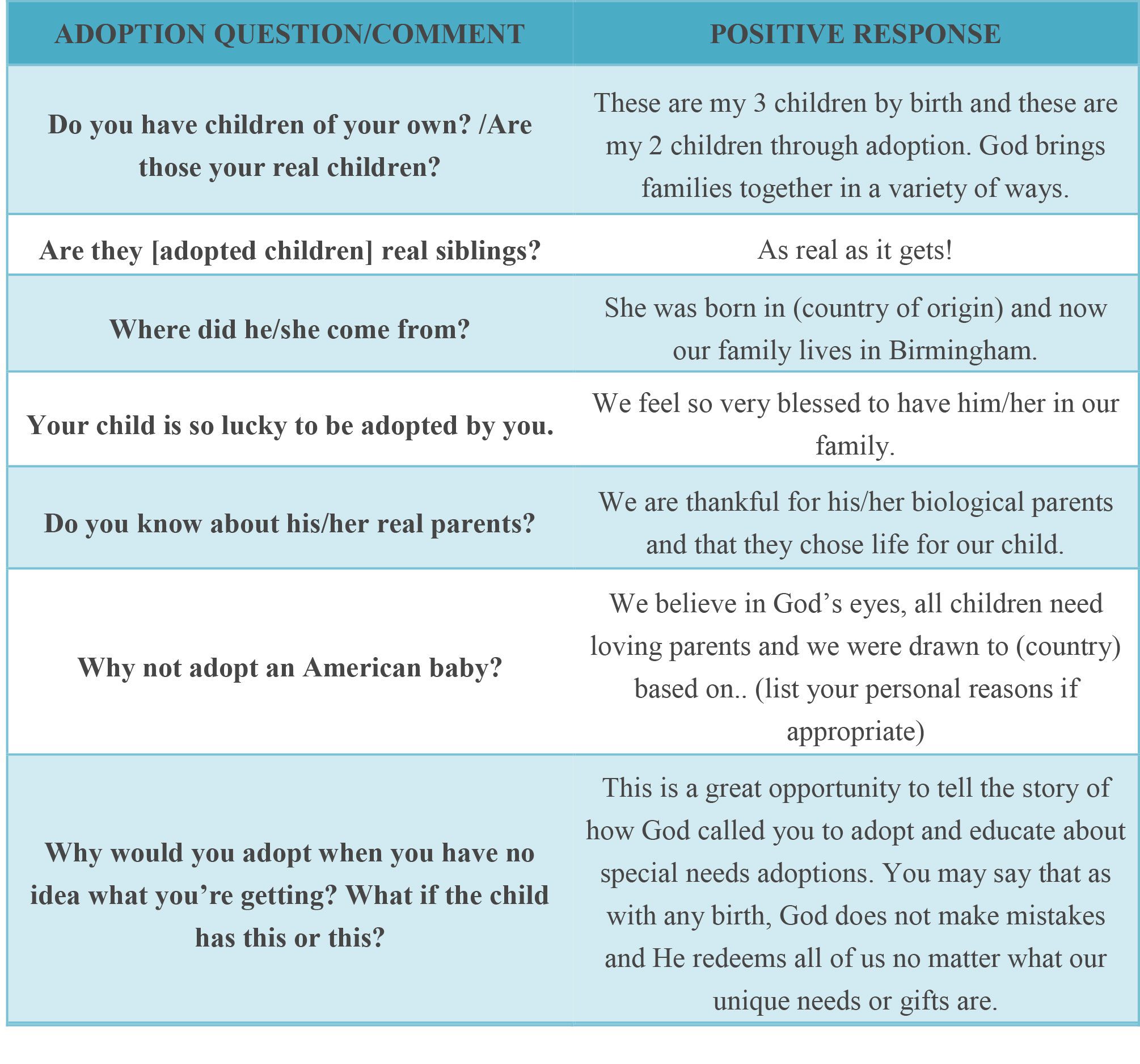 In the frustrating and annoying moments of hearing yet another “Where is she from?” or “Do you have your own children?” it is easy to get discouraged when you don’t know what to say or how to say it. We on the post team want to encourage you to take heart in the fact that these people are asking questions. They want to learn and understand more about adoption. One Lifeline mom pointed out that she looks at an adoption-related question or comment as “an occasion to be reminded of all the joy [God] has blessed us with through the miracle of adoption!” Another mom stated that adoption has “made [her] an evangelist.” As an adoptive family, you are in a unique situation to show others the grace of Christ in your response to demanding questions and comments.