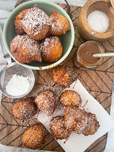 Combine ricotta, eggs, sugar, and vanilla by whisking. Add in flour, baking soda, and salt. Use a wooden spoon or spatula to combine all ingredients. With lightly floured hands, make a roundish blob of dough, about the size of a doughnut hole. Place the dough balls on the parchment paper and continue until you’ve used all of the dough. They won’t look great and will be sticky, but they’ll come together in the fryer! When the oil is at temperature, place about four at a time in the oil. Turn to cook evenly, until they are golden in color. Lay them on the wire rack to cool. Serve with powdered sugar or your favorite caramel sauce. Eat while still warm.